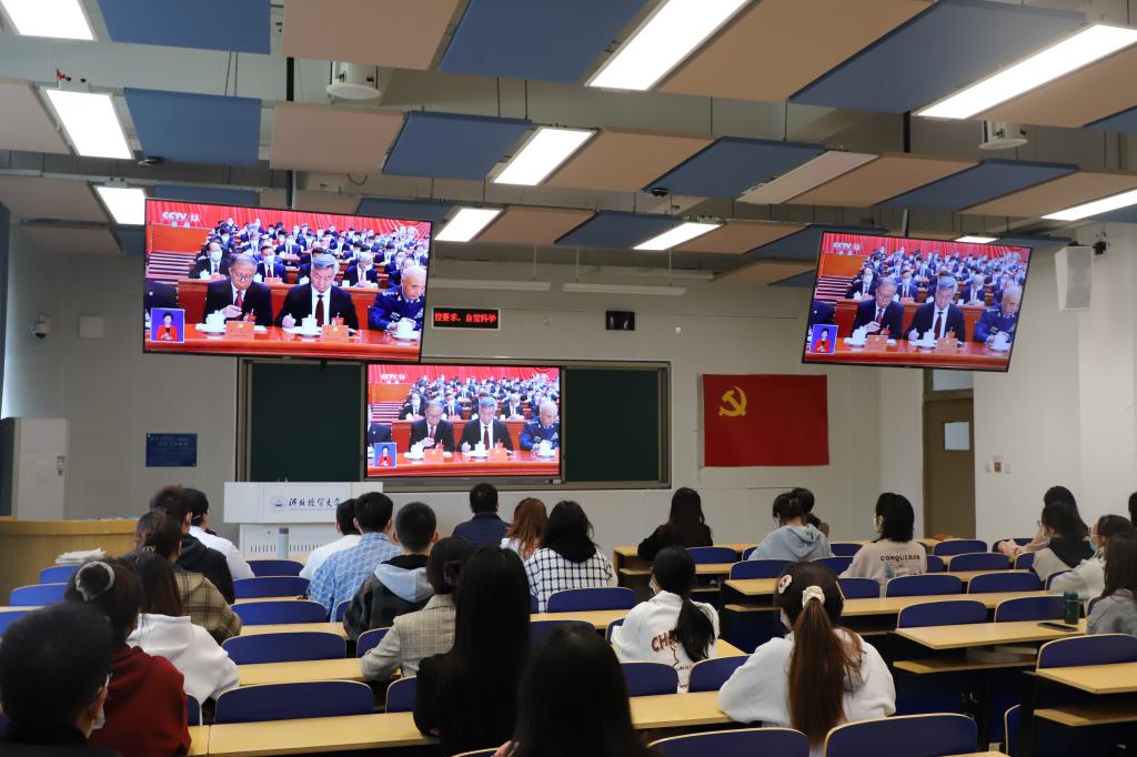 班子成员及全体行政支部和学生代表于学院二办301线下集中观看本次直播。全体2022级新生分别于第三教学楼A202、A203、A204和A208观看,学生第一第二党支部于第三教学楼A103观看,其余党支部和班级组织集体线上观看。