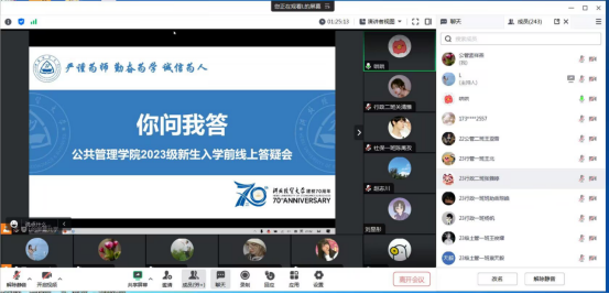 此次答疑会是2023 “公管讲堂”的第十六讲,通过线上答疑的形式为师生交流提供了平台,让新生提前了解学院,了解大学生活。“公管讲堂”自2021年举办至今已是第三年,是学院重点打造凝练的育人品牌活动,旨在结合学院实际,以适应大学生活为导入,对学生日常行为、学习状态、宿舍生活等各方面进行教育,拉进师生距离,利于学生尽快适应新学期学习生活节奏,充满自信开启大学校园生活。
