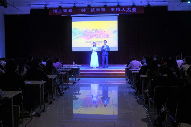 于大学生活动中心三号厅举办“谁‘主’青春,‘持’就未来”主持人大赛,学院学生会副主席张明杰、刘晓凯、校广播台优秀主播李佳兴受邀担任大赛评委,2018级全体同学参加。