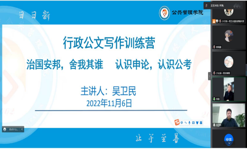 邀请文京教育首席研究与辅导专家吴卫民以腾讯会议的形式作讲座。讲座由学院党委副书记孟祥燕主持,学院辅导员及行政公文写作训练营同学线上参加。
