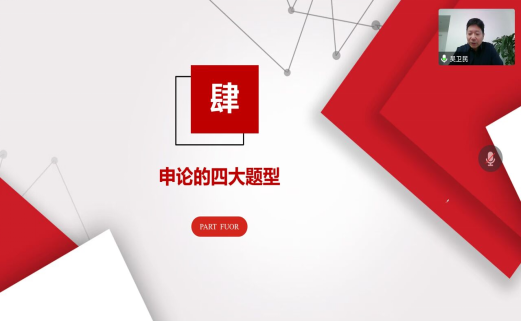 吴卫民从申论的历史渊源及时代变革讲起,阐述了申论是什么以及申论考察的能力有哪些,并着重对申论考查的四大主要题型进行了详细讲解。他采用真题再现的方法,演示了如何从综合分析、解决问题、文字表达、贯彻执行等四个方面对申论的题目进行分析与写作。同学们纷纷表示收获颇丰,对申论是什么、为什么、怎么写有了更清晰的认知,也明确了今后的努力方向。