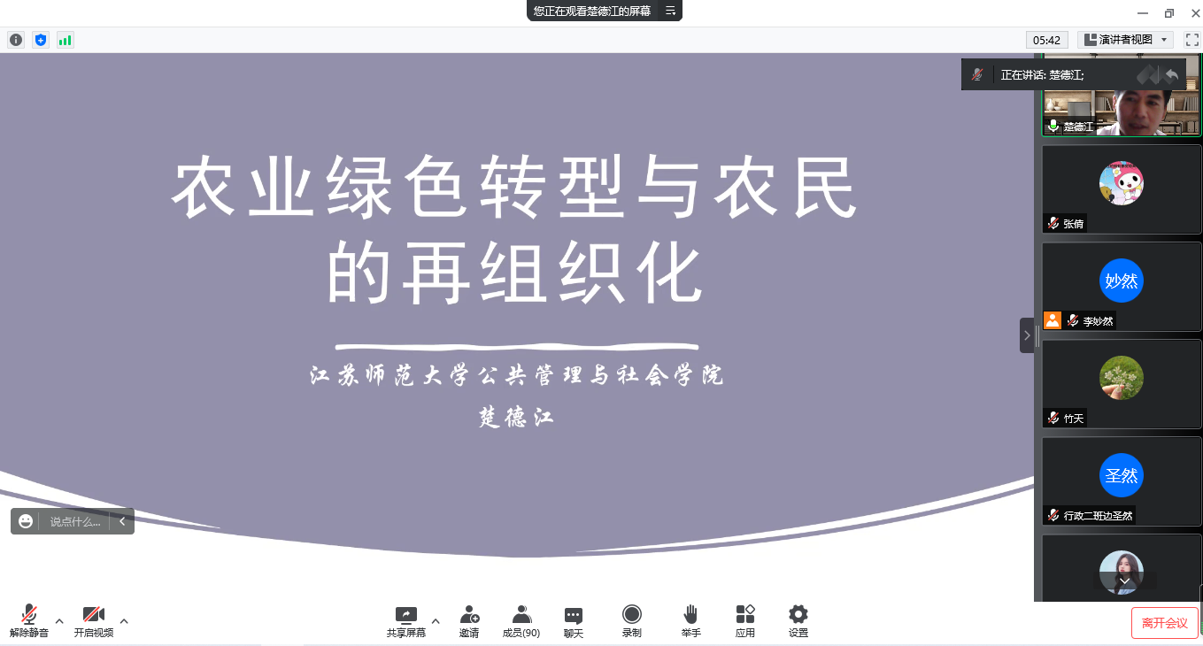 邀请江苏师范大学公共管理与社会学院楚德江教授做题为“农业绿色转型与农民的再组织化”的学术讲座,学院教师和学生共100余人参加。