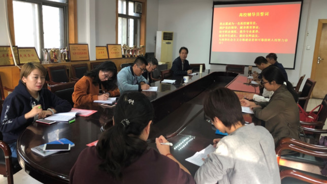 于第二办公楼301室举办新任职辅导员宣誓仪式。学院党委书记薛向东、院长蔺丰奇出席,副书记白玉祥主持,全体专兼职辅导员参加。