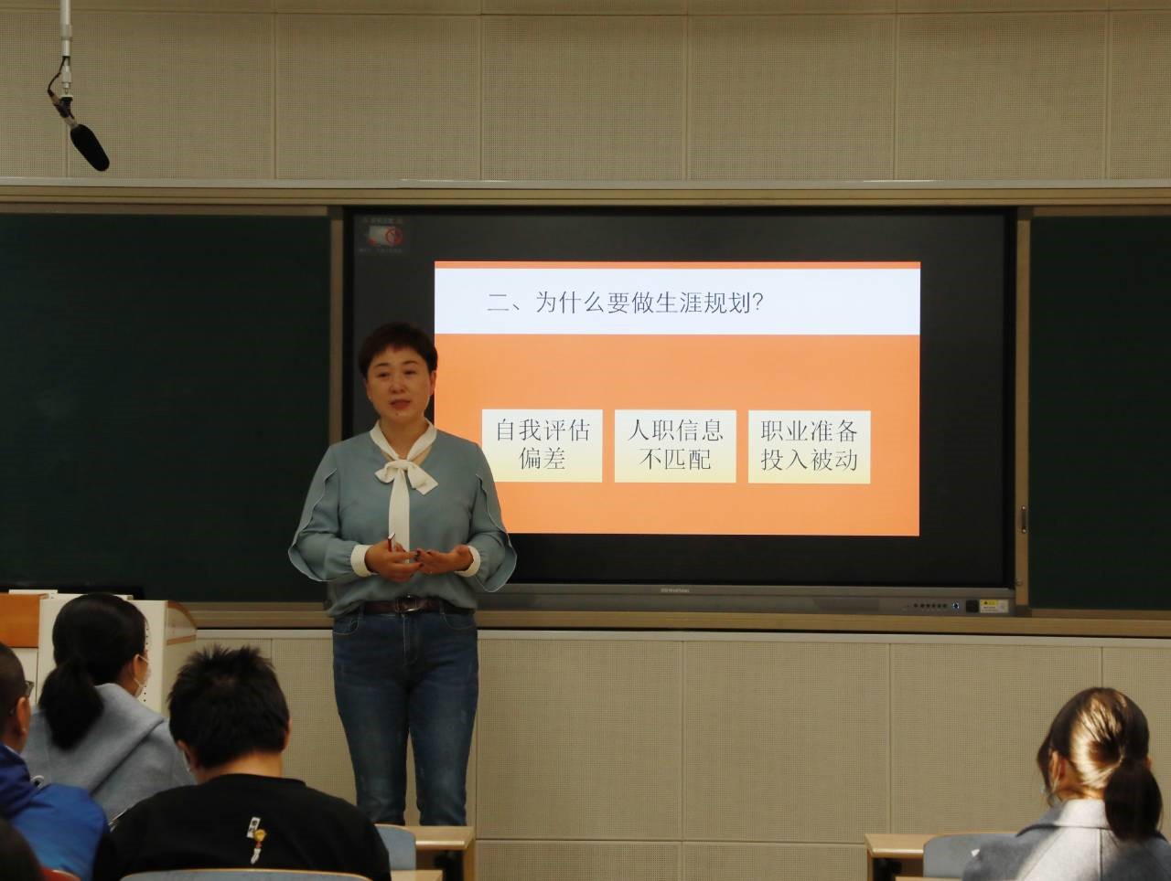 首先,李海霞为同学们进行了择业、创业等方面的分析讲解,并指明职业生涯规划是人一生中职位的变迁及职业目标的实现过程,然后通过“一个想教钢琴的女孩”等实例来阐述职业生涯规划的必要性。还向同学们分享了做好职业生涯规划“五步法”以帮助学生进一步了解自己的就业情况,其中,第一步:客观认识自我,准确职业定位;第二步:评估职业机会,知己知彼;第三步:择优选择职业目标和路径;第四步:终身学习,高效行动;第五步:与时俱进、灵活调整。最后,李海霞对此次讲座进行总结即职业没有好坏之分,适合自己就好,并希望同学们朝着自己选择的目标不懈努力。