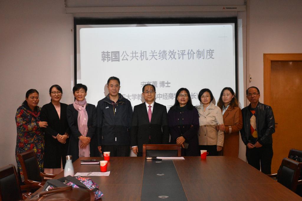 10月14日下午,公管学院在二办201会议室举办题为“公共机关经营评价制度”的学术讲座,此次讲座邀请韩国又石大学中国通商系教授宋在薰博士为主讲人,蔺丰奇院长主持,学院部分教师及18、19级全体研究共同参加。