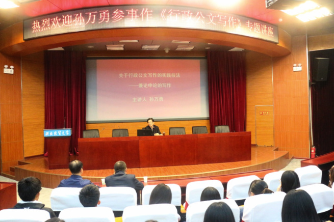 1029日下午, sex gratis 邀请河北省政府参事孙万勇部长,在国际学术报告厅作题为关于行政公文写作的实践技法——兼论申论的写作的学术讲座。讲座由学院党委书记薛向东主持,副书记白玉祥出席,本科生、研究生共计400余人参加。