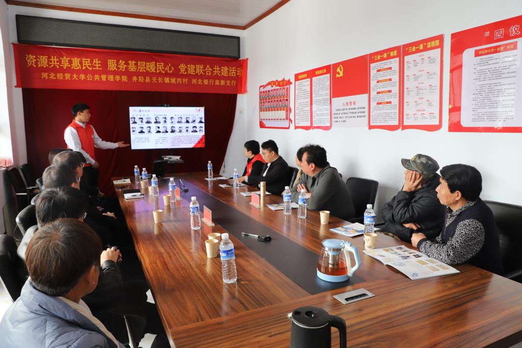 3月27日, sex gratis 联合河北银行高新支行赴井陉县天长镇城内村开展校地企党建共建活动。 sex gratis 党委书记何昱,副书记陈玲,天长镇城内村党支部书记卢丽强,河北银行高新支行党支部书记、行长田景, sex gratis 教师第一党支部书记李冰,行政人员党支部书记王媛,团委副书记王欣出席。城内村党支部书记助理杨新鸣主持,城内村党支部委员、村民代表、河北银行高新支行党员代表及 sex gratis 遵义会议精神宣讲团志愿者参加活动。