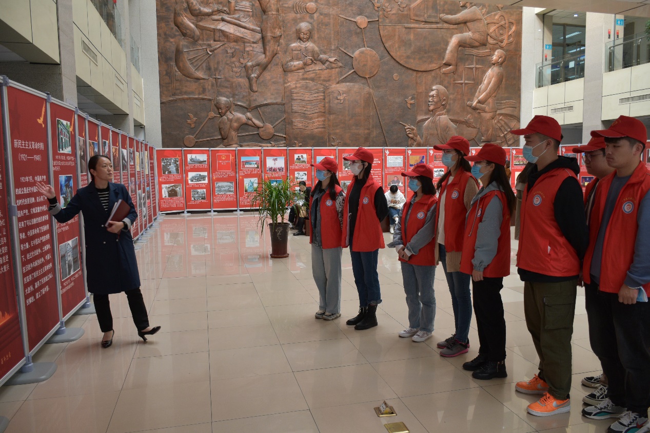 10月7日下午,学院党委副书记兼辅导员孟祥燕带领同学们重温了校图书馆的建党100周年图片展,并结合“七一”重要讲话内容对部分图片进行了重点讲解。在抗美援朝图片前,她通过分享观看影片《长津湖》的体会,剖析了志愿军敢于牺牲、无私奉献的精神。随后,在图书馆的党史阅览室里,孟祥燕为同学们讲解了“七一”重要讲话中的主要内容,鼓励同学们锤炼自身,增强志气、骨气和底气,在实践中掌握真正本领。团支部书记李瑞雪介绍了在校图书馆开展志愿服务活动的情况,并对全体团员发出倡议:学党史、强信念、办实事,将学党史的成果体现在专业的志愿服务活动中。最后,同学们纷纷发言,畅谈了自己近期学习“七一”重要讲话及党史的心得体会。