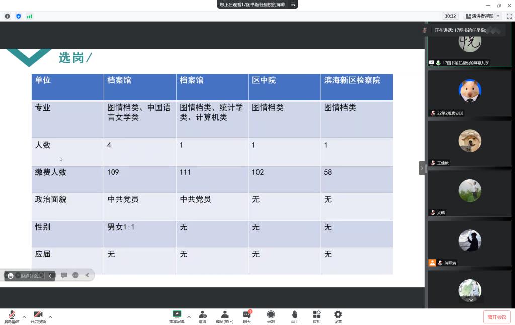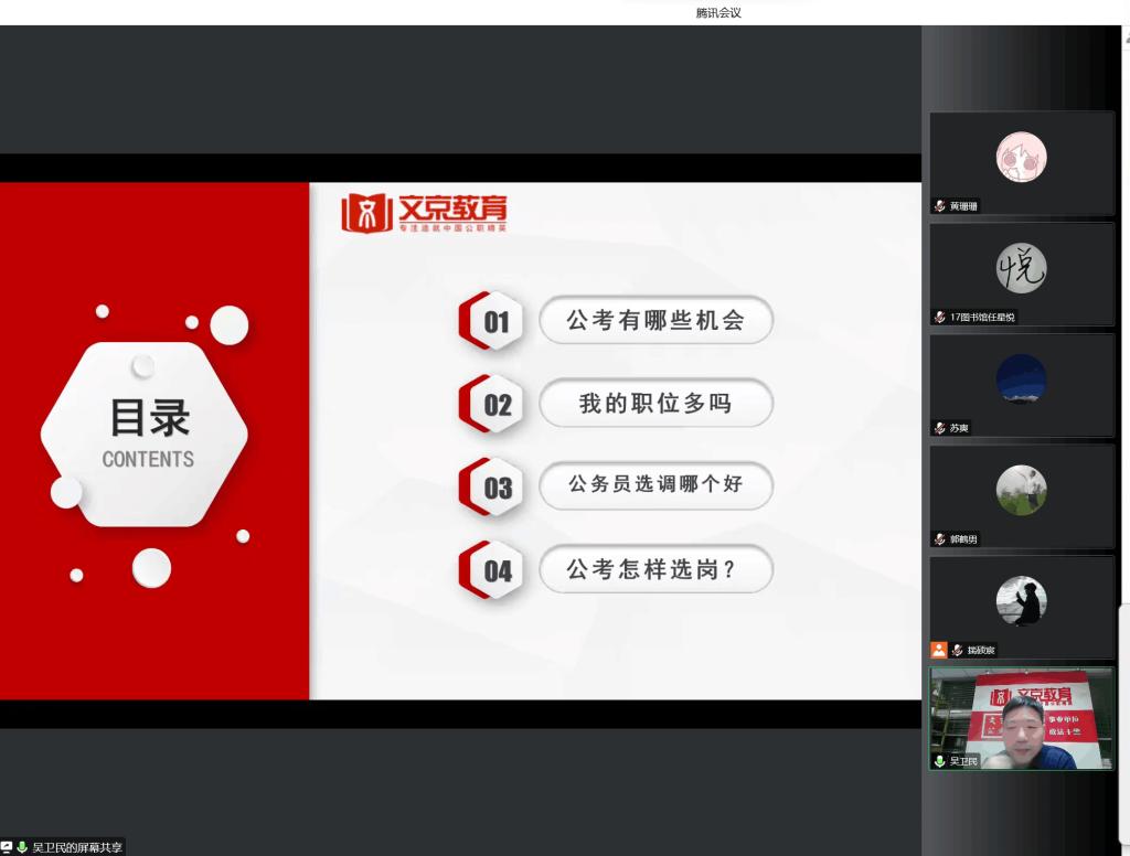 组织线上公考交流会。本次分享会由学院团委书记郭鹤男主持,邀请文京教育指导老师吴卫民和优秀公考毕业生王佳俊、任星悦、邢洪魁、陈铭希四位同学进行分享和解惑。院党委副书记孟祥燕出席,有意参加公考的学生参与了本次交流。