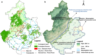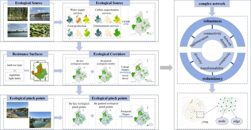 生态安全格局政策已成为中国协调生态系统保护和经济发展的重要手段之一。高星课题组的《Ecological source identification and ecological security pattern construction from the perspective of ecosystem service supply and demand: A case study of Baiyangdian Basin in China》研究立足于中国生态安全格局建设的战略需求,以生态系统服务供需平衡为切入点,构建了白洋淀流域生态安全格局优化框架。对供水、碳封存、粮食生产和娱乐服务这四种生态系统服务的供需进行了定量评估。研究结果显示:(1)流域内存在163个生态源地(总面积6479.24平方公里),主要沿太行山脉西北部及中东部河网带呈集聚分布;(2)通过电路理论模型识别出76条战略生态廊道(总长3241.63公里)和124个生态关键节点,包括74个生态夹点、30个一般夹点和20个生态障碍点,形成“三区一带多廊多点”的复合式生态网络架构;为雄安新区和白洋淀流域的生态系统管理和国土空间生态恢复政策的制定提供了科学决策支持。