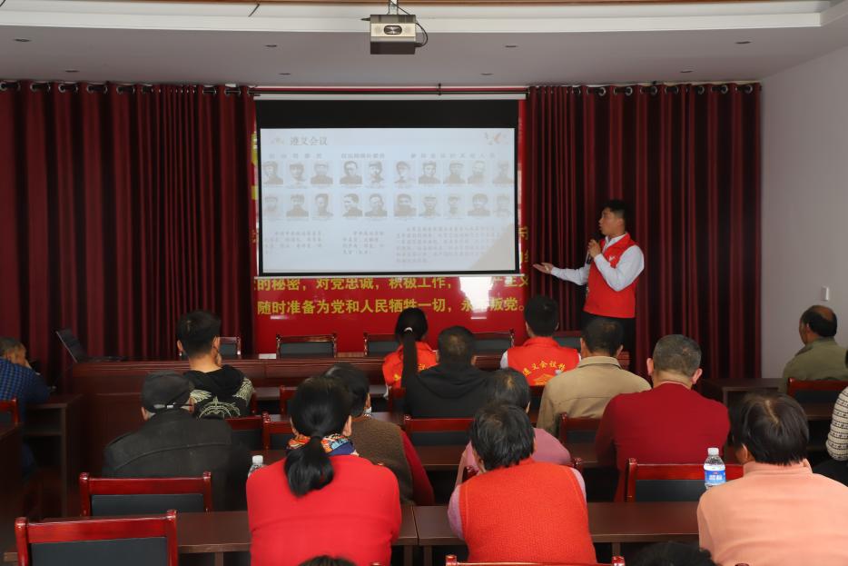 遵义会议精神宣讲团的三名志愿者按照时间线索为党支部的党员们介绍了遵义会议前后召开的七次重要会议。志愿者们通过视频片段和地图分析,将遵义会议的开端、转折及延续生动地展现出来,他们结合红军四渡赤水、强渡乌江等鲜活故事,深刻剖析了革命先辈“坚持真理、坚定信念、实事求是、团结统一”的精神内核,带领党员同志们深入了解了遵义会议“伟大转折”的政治和历史意义。